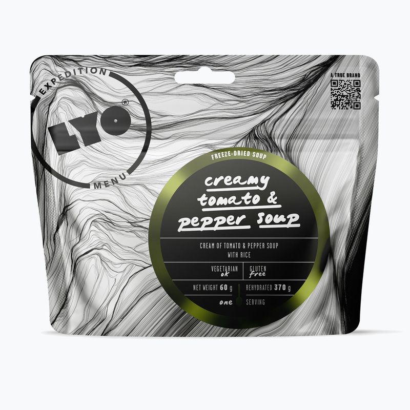 Żywność liofilizowana LYOFOOD Kremowa zupa pomidorowa 60 g opiera się na naturalnych składnikach, które zostały dobrane tak, aby stworzyć harmonijną całość. Pieczone pomidory i czerwona papryka odpowiadają za intensywny smak, a ryż uzupełnia potrawę węglowodanami. Kremowa konsystencja sprawia, że posiłek jest przyjemny w odbiorze i odpowiedni do spożycia w każdych warunkach terenowych.
