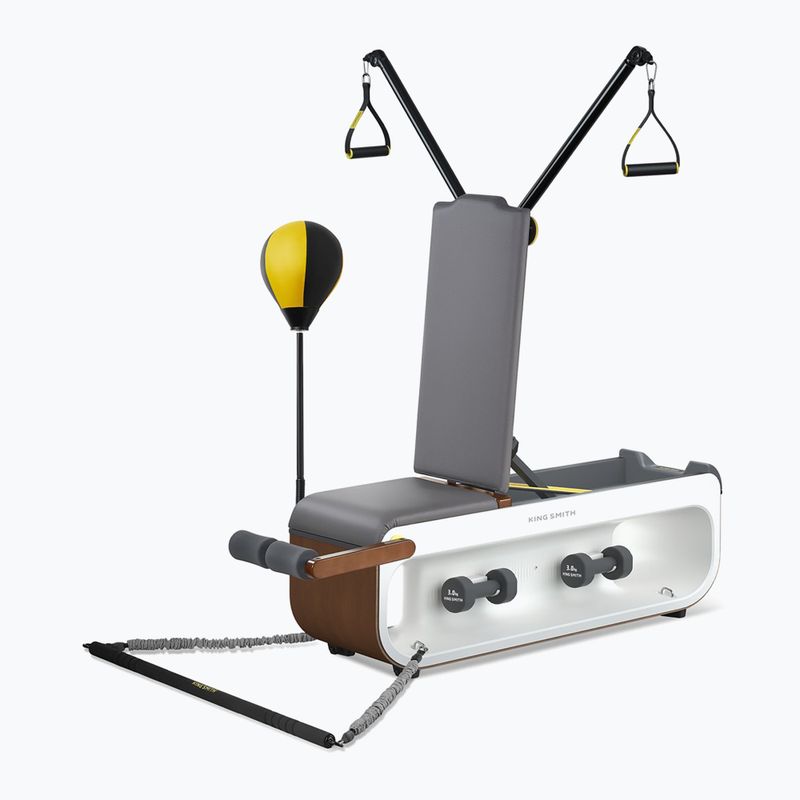 Ławka do ćwiczeń Kingsmith FBB1C została wyposażona w 15 elementów dodatkowych, które pozwalają na kompleksowy trening każdej partii mięśniowej. W zestawie znajdują się między innymi hantle, liny oporowe o zróżnicowanym oporze, uchwyty wielofunkcyjne, drążek treningowy, piłka bokserska oraz ramię balansowe do ćwiczeń core. Tak bogate wyposażenie umożliwia płynne przechodzenie od ćwiczeń siłowych do funkcjonalnych, co zwiększa wszechstronność sprzętu.