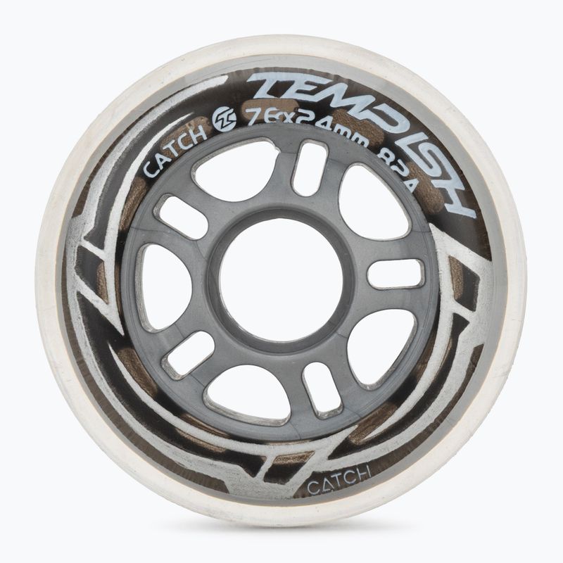 Kółka do rolek Tempish Catch 76 mm/82A – zestaw 4 trwałych, płynnie toczących się kółek o uniwersalnej twardości 82A, zapewniających dobrą przyczepność, stabilność oraz komfort jazdy zarówno w skateparkach, jak i na miejskich nawierzchniach, idealne do rekreacyjnych rolek.